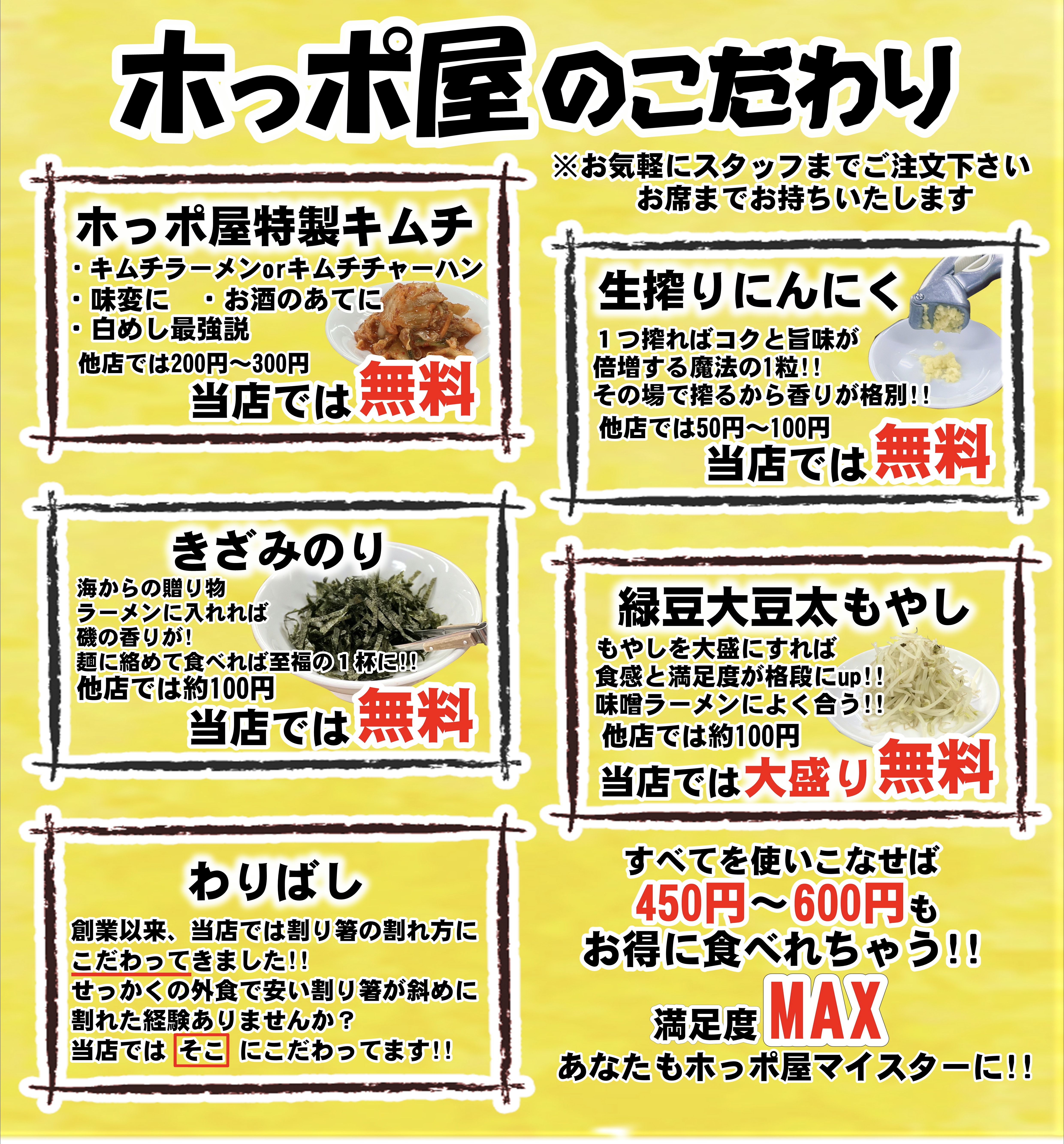ホっポ屋自慢のラーメン・サイドのメニュー紹介。